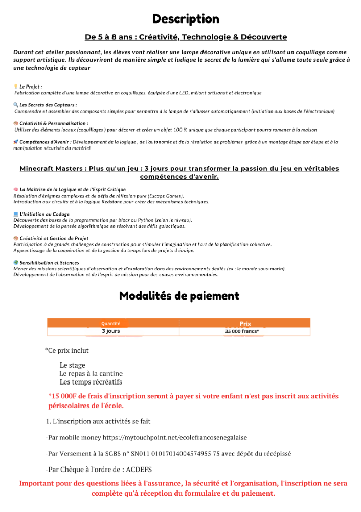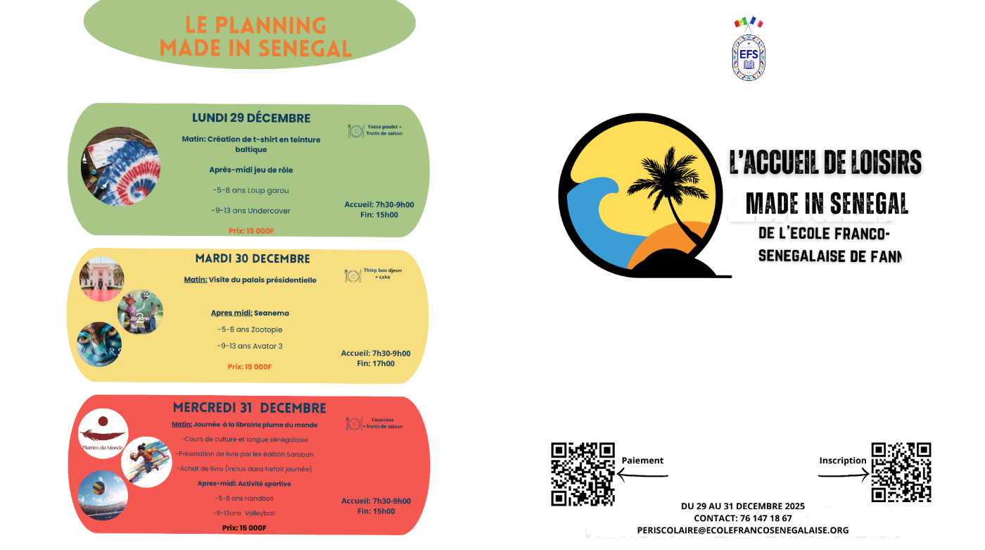 Ateliers créatifs, immersion culturelle (Palais Présidentiel), ciné-club, découverte de la culture et langue sénégalaises, lecture et activités sportives adaptées à l’âge.