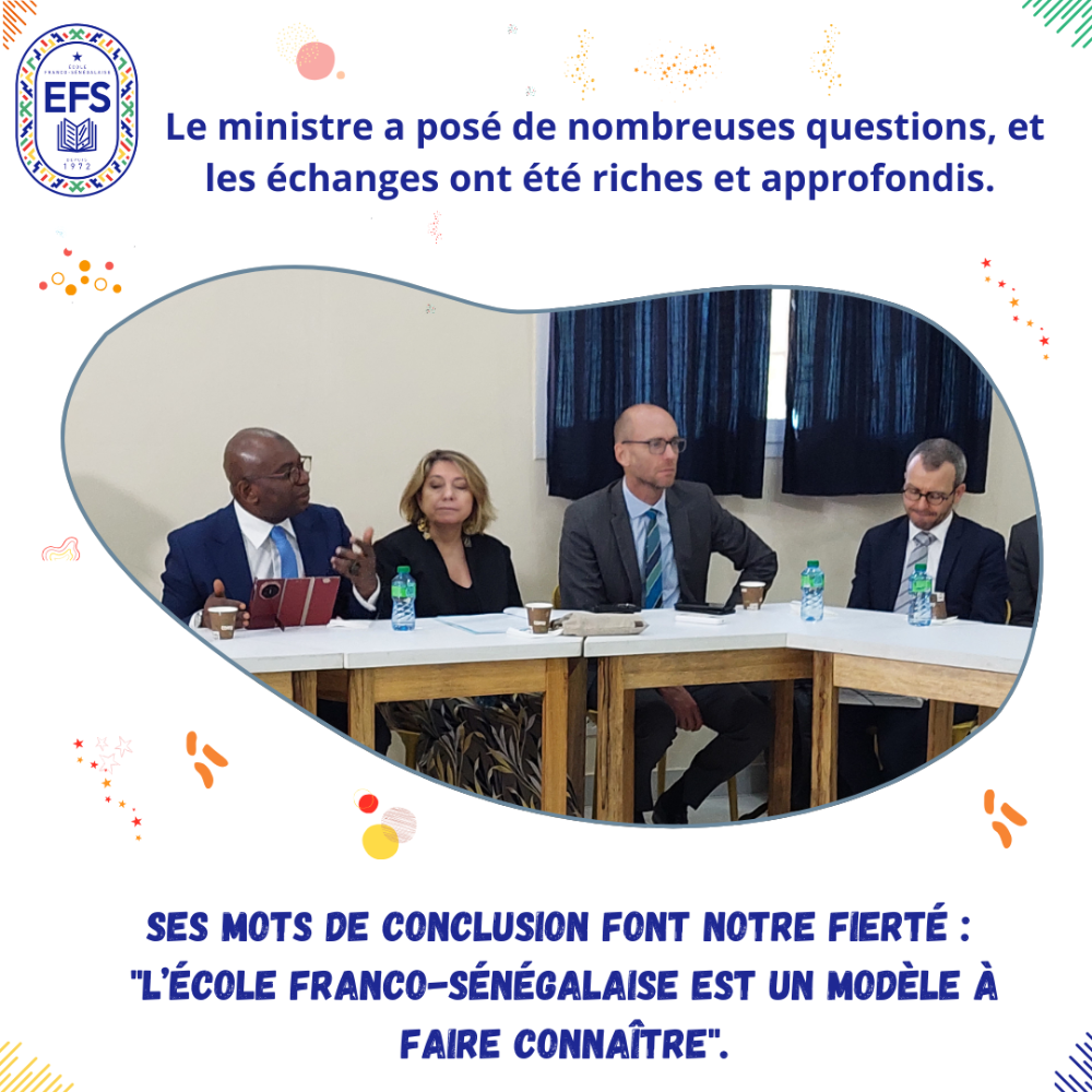 Les discussions ont été approfondies et ont porté sur le fonctionnement de notre école de coopération, l’enseignement hybride et la formation mettant en avant l’aspect spécifique et innovant de notre établissement. Le ministre a souligné que « l’École franco-sénégalaise est un modèle à faire connaître », une reconnaissance qui honore notre engagement !