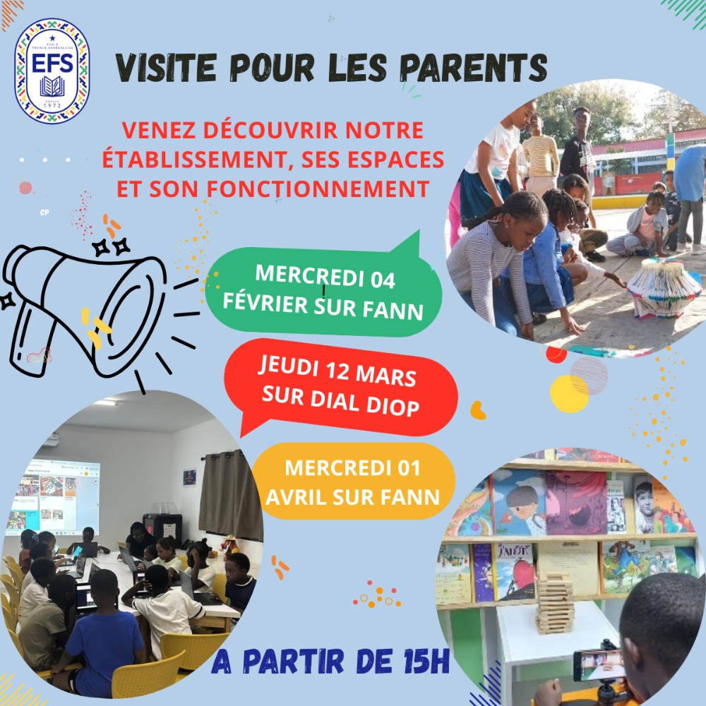 La visite se composera d’un temps de présentation de l’école par la direction et par le coordinateur du service périscolaire. À la suite de ce temps, vous pourrez poser vos questions. Enfin, vous bénéficierez d’une visite du site, des espaces extérieurs, de quelques classes et du FABLAB avec les membres de l’équipe de l’EFS.